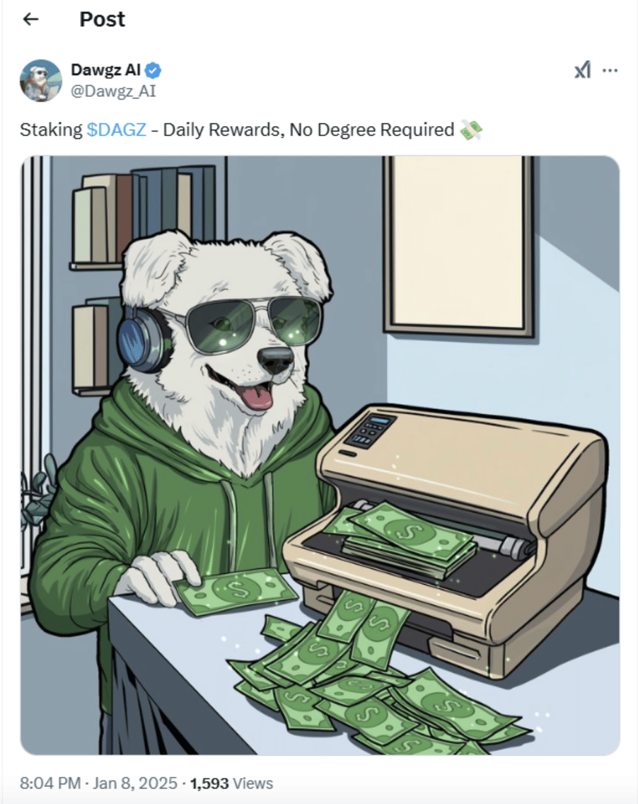 The community is also highly engaged, participating in meme contests and fun activities. The circulating supply of $DAGZ tokens is set at 8,888,888,888 tokens, ensuring controlled distribution and contributing to its value appreciation.
