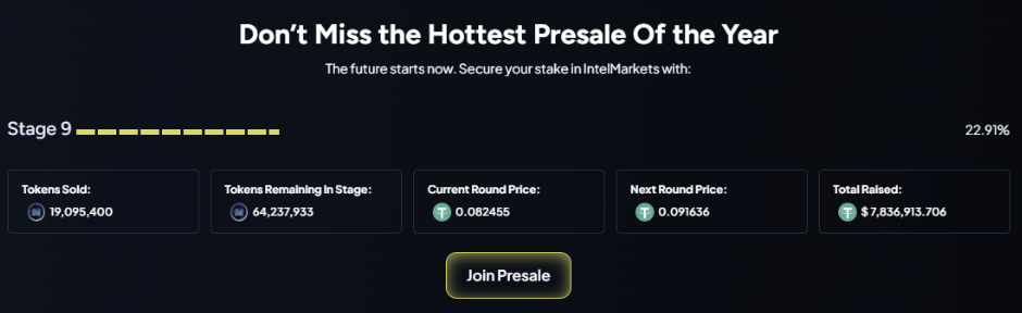 IntelMarkets’ strategic presale has led to increased demand and the potential for a price surge. It is trading at $0.08 in its 9th stage, and the price will increase to $0.09 in the next stage of presale.