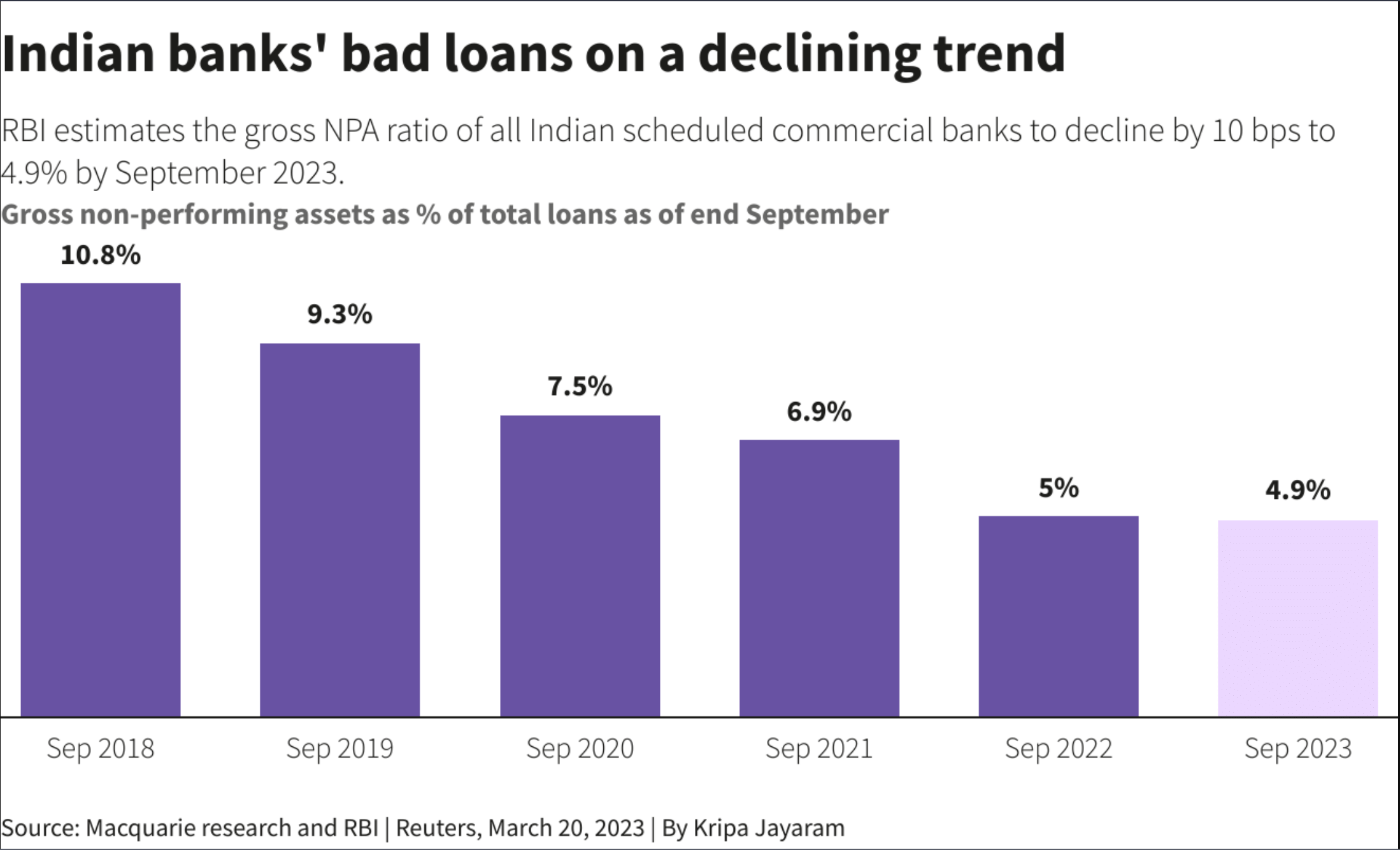 The gross non-performing assets to total advances ratio for Indian banks has been on a declining trend since hitting a high of 10.8% in September 2018. It fell from 5.9% in March 2022 to 5% in September 2022.
