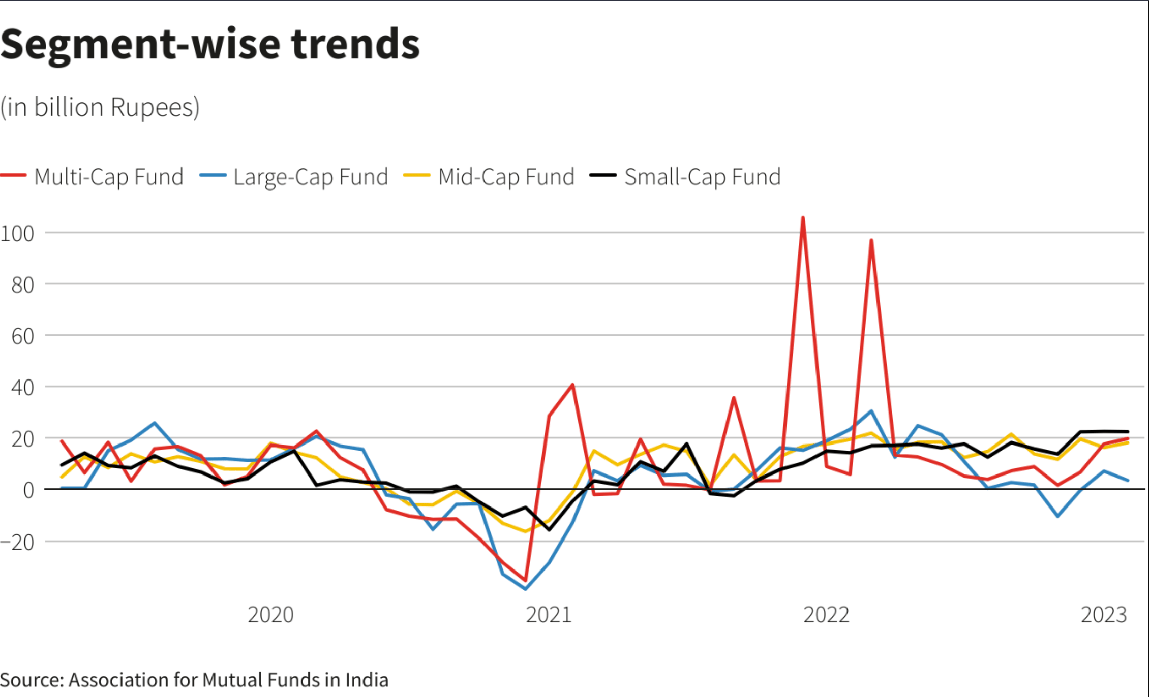 Small-cap funds accounted for most of the investments at 22.46 billion rupees, while inflows into large-cap funds halved to 3.554 billion rupees from 7.16 billion rupees in January.