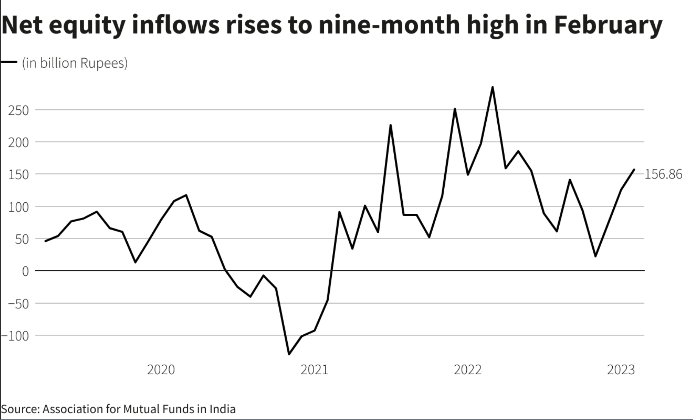 Bengaluru: Inflows into Indian equity mutual funds jumped over 25% sequentially to 156.86 billion rupees ($1.91 billion) in February, the highest in nine months, data from the Association of Mutual Funds in India (AMFI) showed on Friday.