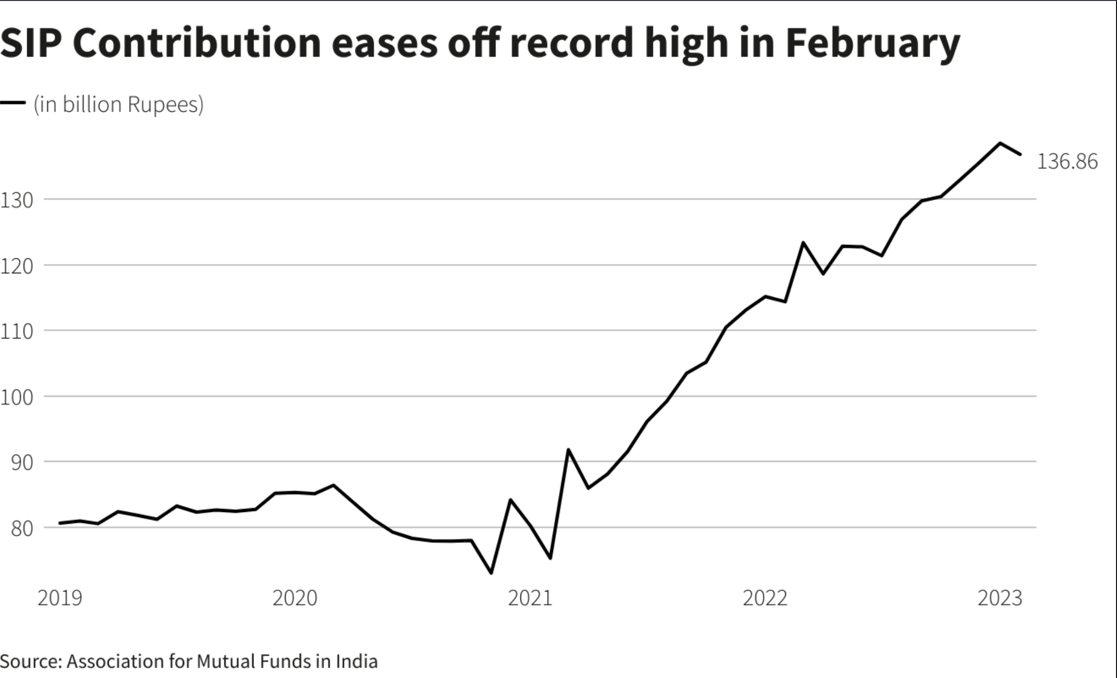 Contributions to systematic investment plans (SIPs) – in which investors make regular payments into mutual funds – fell 1% to 136.86 billion rupees after rising to a new record in each of the last six months, data showed.
