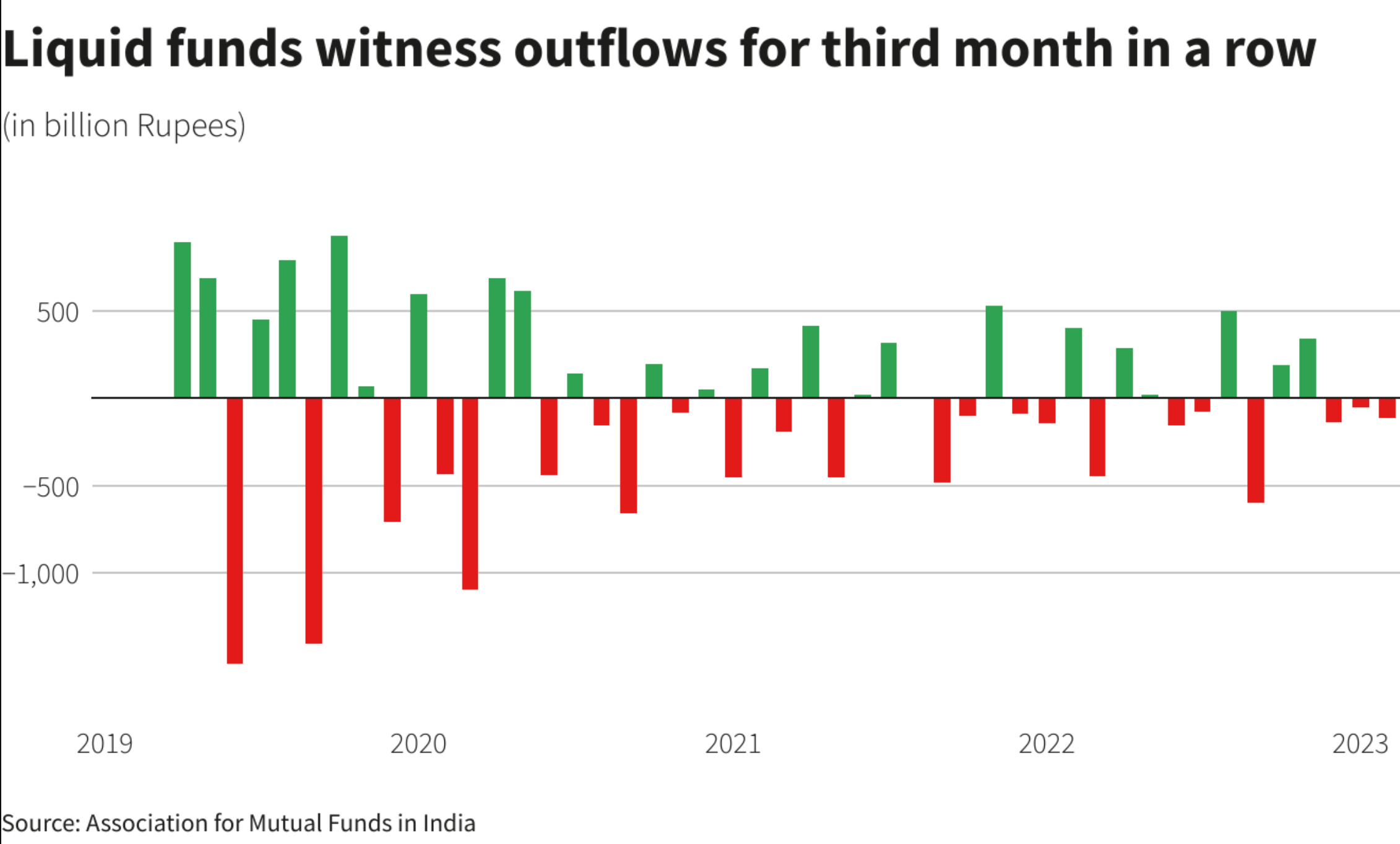 Liquid funds – those that mature in 91 days – logged outflows of 113.04 billion rupees, according to AMFI.