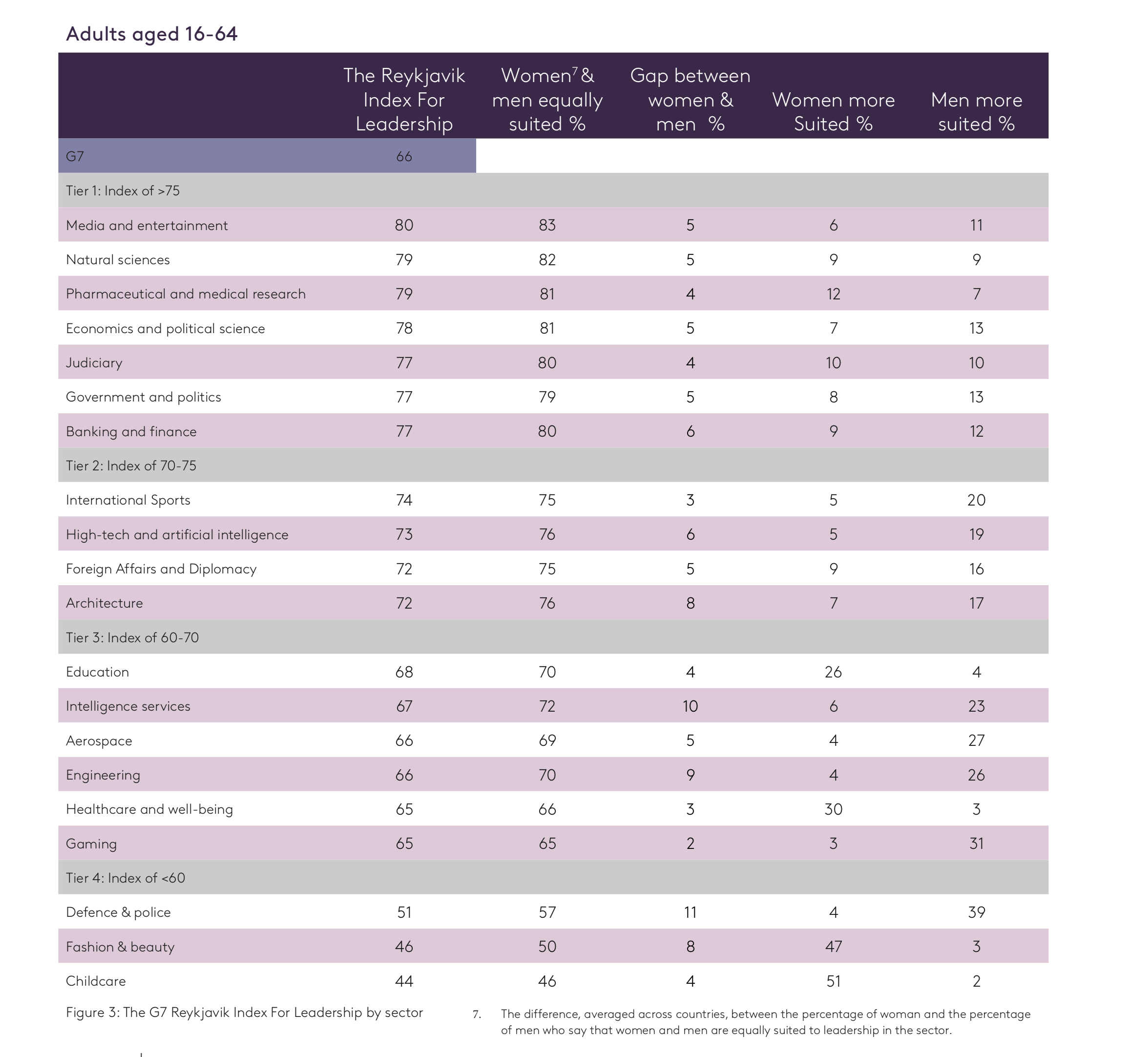 Across the G7, the Reykjavik Index for Leadership is higher for women (67) than for men (61). This means that women in the G7 are more likely than men to view women and men as equally suitable for leadership roles. This is the case for both the overall G7 and also within every individual G7 nation and in each of the 20 sectors covered in the research.