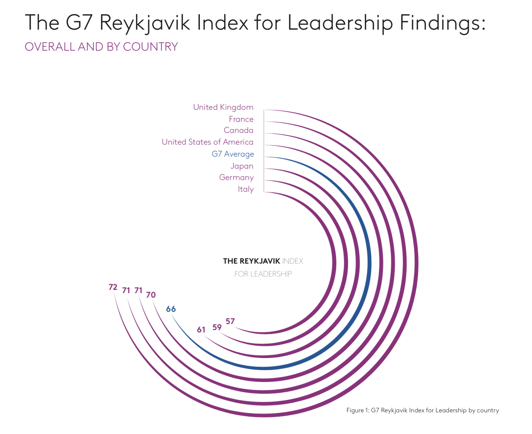 The Reykjavik Index for Leadership for the G7 nations in this, our launch year, is 66. The Index shows that the G7 divides into two groups of countries. First, a group of four that have higher indices: the UK (72), France (71), Canada (71), and the US (70). The higher scores in these four nations are an indication that progress is happening. However, there is still a long way to go in these countries before we see complete acceptance of men and women in leadership roles – and thus equality for men and women.