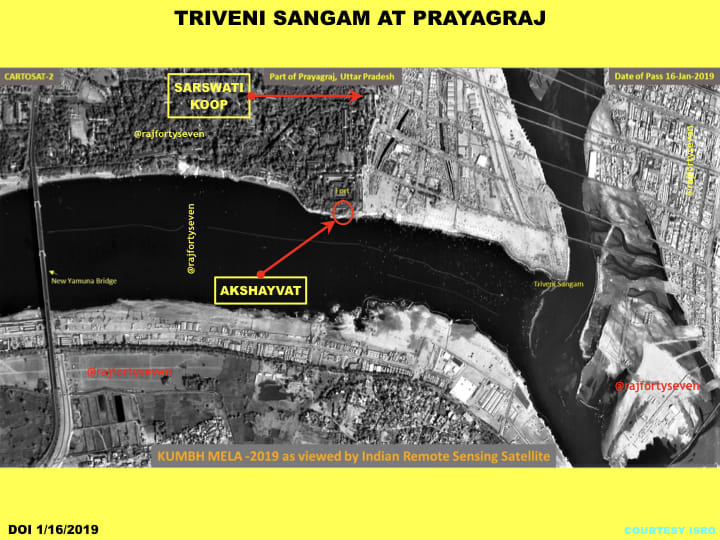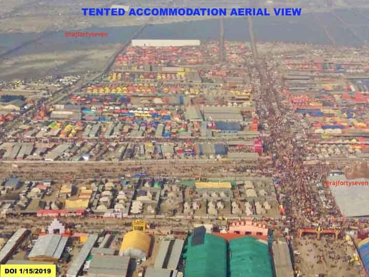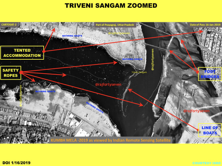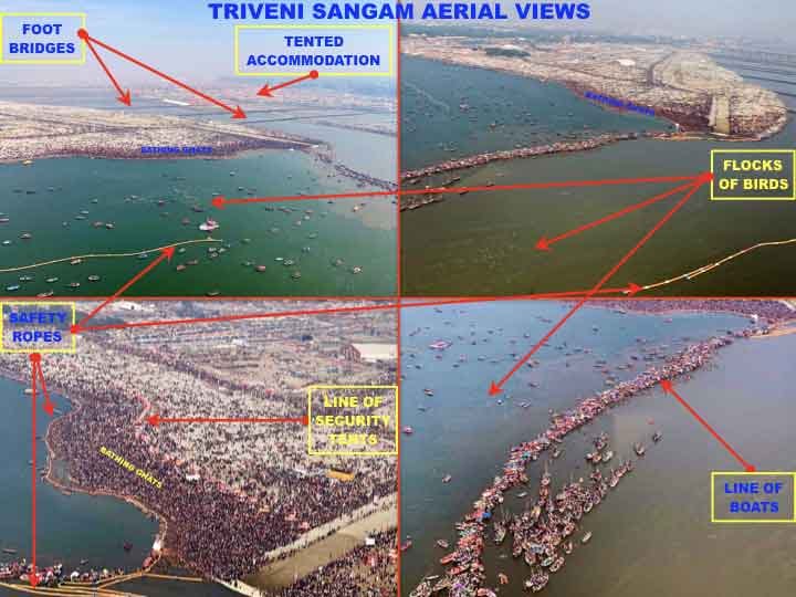 Satellite and aerial images show clearly all the safety ropes and other traffic management arrangements. The sea of humanity visiting Prayagraj is managed by barricades and 24×7 live CCTV monitoring.
