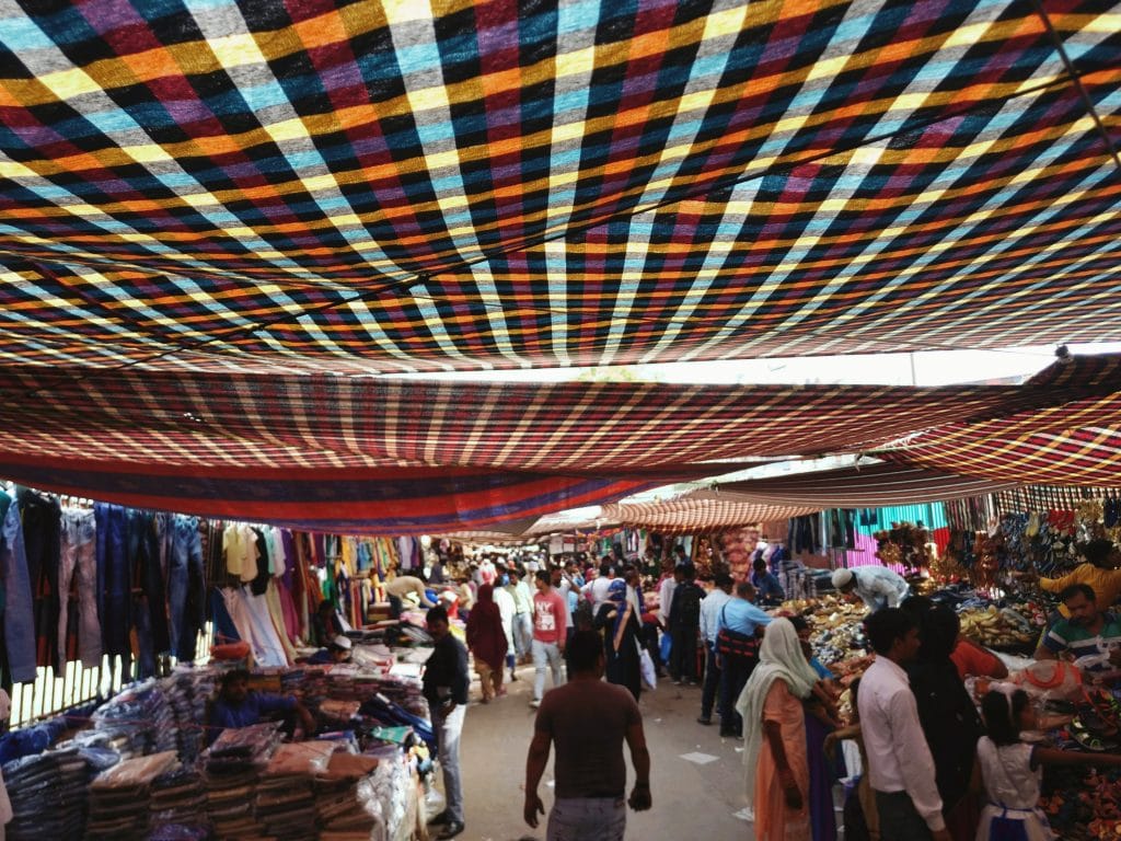 As we walk a little further, the crowded and veiled underworld of Meena Bazar crashes onto us like a sudden explosion of confetti. Sheets of patchwork fabric flutter in the wind, colouring the shade with silhouetted hues of oranges and reds that suspend the reality of the sun for a passing moment. In the old world of Delhi however, the respite of covers above your head comes at a cost — Meena Bazar is notorious for pickpockets and petty thieves, who use the unsteady jostle of a merchant market to cut purses with sharp knives.