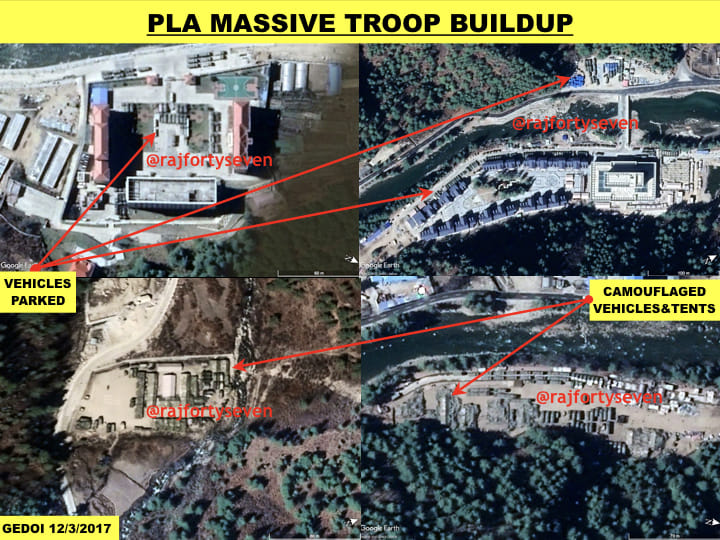 There is also a massive buildup of troops just below the conflict area of Doklam. A large number of vehicles are seen parked near the riverside. In some areas, vehicles are seen hidden under camouflage nets. A number of tents have also been observed under camouflage nets.