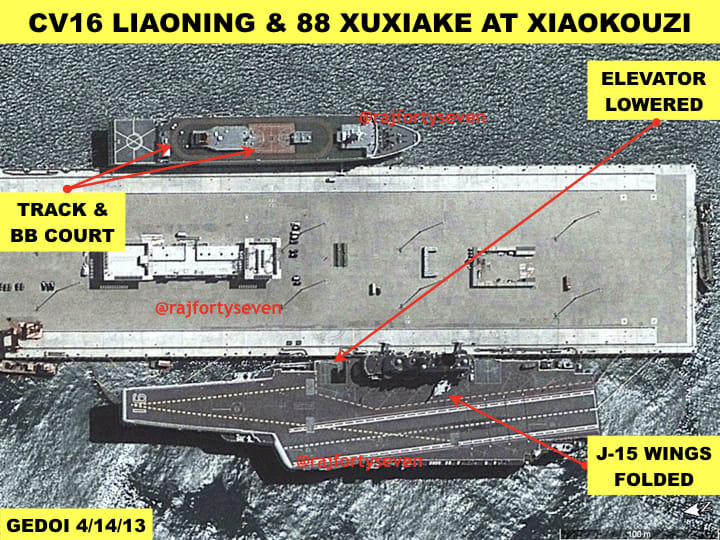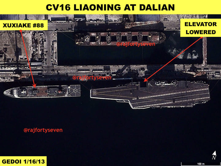 Satellite images show a carrier and a general supply vessel, along with large amounts of loads, being parked at Xiaokouzi, 45 km southwest of Qingdao.