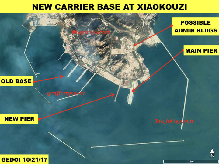 The Chinese navy has constructed two bases specifically to station its carrier vessels. The first one was carved out of a mountain at Xiaokouzi, 45 km southwest of Qingdao. Recently, an additional pier was being constructed, possibly to hold the support vessels.