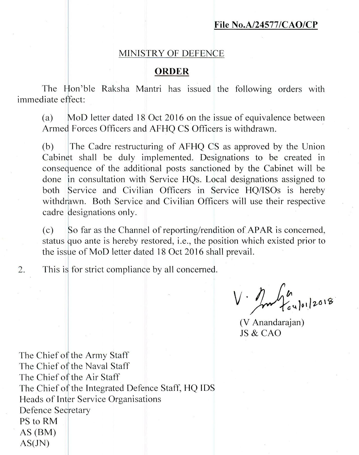 Restoring a pre-2016 order of precedence and reporting, the minister has ordered that restructuring of the civilian cadre will be carried out at a later stage as approved by the Union Cabinet.
