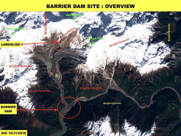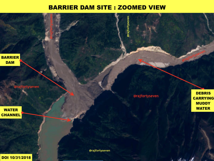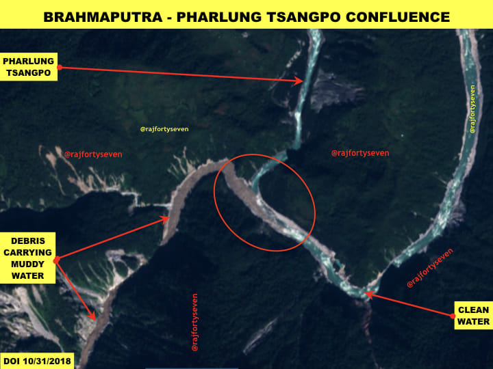 Latest satellite images from Tibet’s Mainling and Metok areas very vividly tell us that a possible landslide between 26 and 31 October triggered a major event, creating a barrier dam on the Brahmaputra.