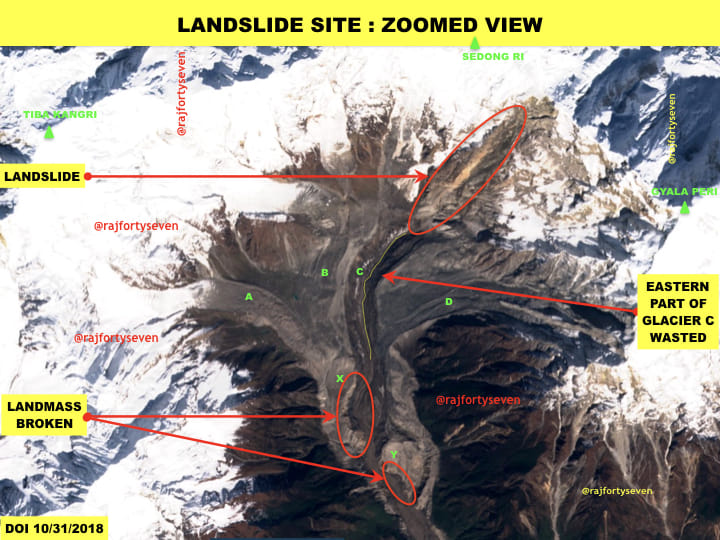 According to satellite images from 31 October, a landslide on the southern face of the Mt Sedong Ri ridge possibly caused the eastern part of one of the four glaciers — marked C, the main one – to break off.