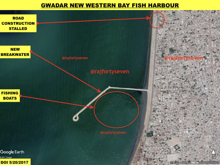 The Chinese government has promised to build a large harbour for fishermen’s ease on the western side of Gwadar but nothing has been done in this regard. The pier constructed is neither a pier nor long enough as planned. Recent images show a breakwater type of structure rather than a pier.