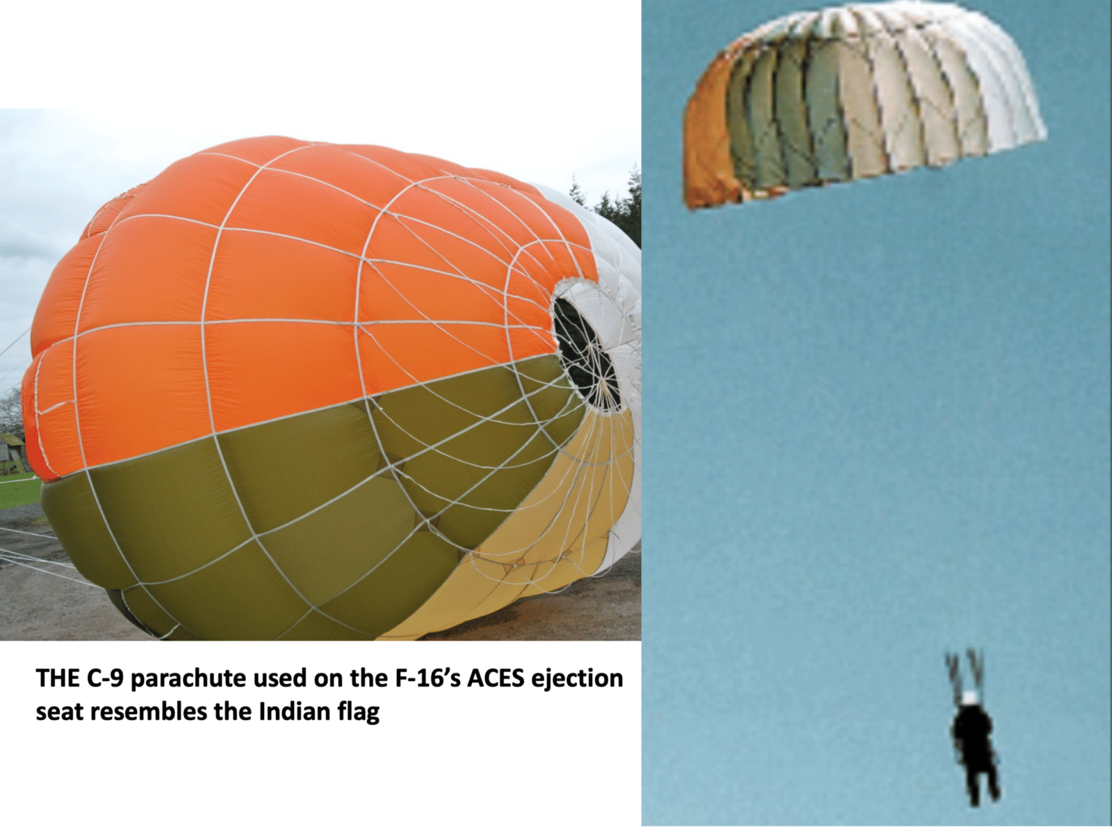 4# Many witnesses claim to have seen a parachute with colours of the Indian flag — A very significant detail, which emerged in many videos on the social media. On closer analysis, a startling fact emerges — the colour of the C-9 parachute on the PAF F-16’s ACES ejection seat has four colours — white, orange, jungle green and sandy brown — eaily anyone taking a look at the same will assume it to be an Indian parachute due its uncanny resemblence to the Indian flag.