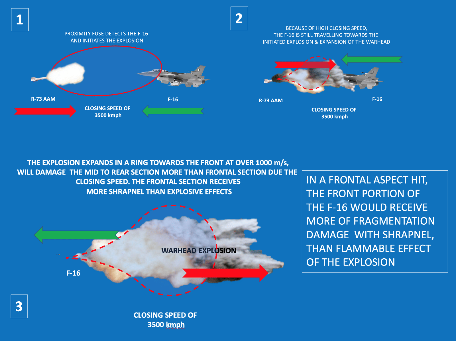Now when the R-73’s warhead would have exploded and expanded ‘outwards’ ‘towards’ the front at over 1000 m/s, the closing speed of over 3500 kmph would have ensured that the F-16 itself would be coming towards the explosion at 972 m/s.
