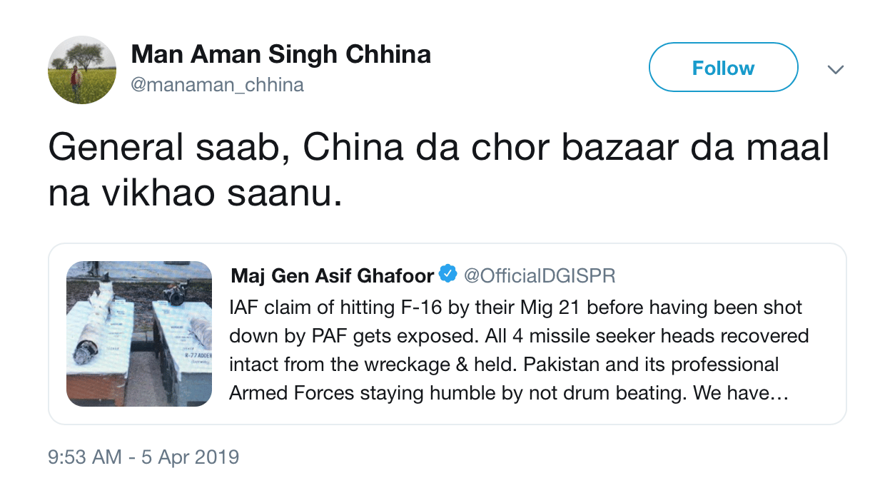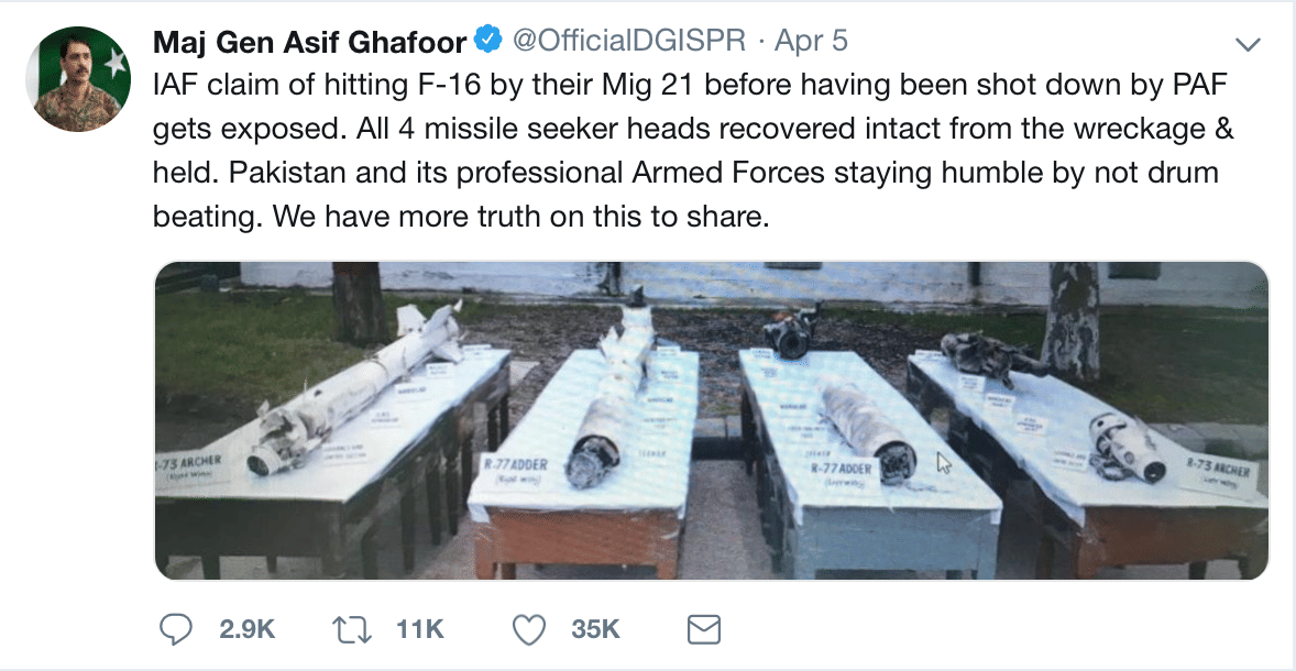 How the Pakistani state has managed to clamp down on eyewitness accounts, online videos of the crash and initial ISPR flip flops — to obscure the fact that a PAF F-16 jet was shot down by an Indian Air Force MiG-21 Bison on 27 February 2019. Interestingly, after over a month post the aerial clash the narrative is being twisted significantly — with a distinguished foreign media house jumping in the fray and claiming that no F-16 was shot down by the IAF that day. Nothing could give more succour to the dirty tricks department at ISPR, led by the infamous Major General Asif Ghafoor of the Pakistan Army, who has been at the forefront of Pakistan’s hybrid war campaign to deny any manner of worthwhile information scrutiny on the matter since the day the PAF lost one of its most advanced platform to a bold and gritty IAF counterattack. While the evidence is right in front of us to sift through its worth; the first indication of a massive coverup by the Pakistani state on this intriguing subject was provided by none other than Major General Ghafoor himself — who it seems, was overwhelmed by the ‘truth of it’ all in those initial few hours post the aerial clash.