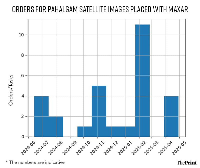 New Delhi: Two months before terrorists killed 26 people in Kashmir, a top US-based space tech company saw an unprecedented spike in orders for high-resolution satellite images of Pahalgam and its surrounding areas. Between 2 and 22 February 2025, at least 12 orders—double the usual number—were placed with Maxar Technologies, whose roster of clients includes government and defence agencies across the world. Orders for Pahalgam satellite images started appearing on the portal in June 2024, just months after Maxar acquired a new partner: A Pakistan-based geo-spatial company linked to federal crimes in the US.