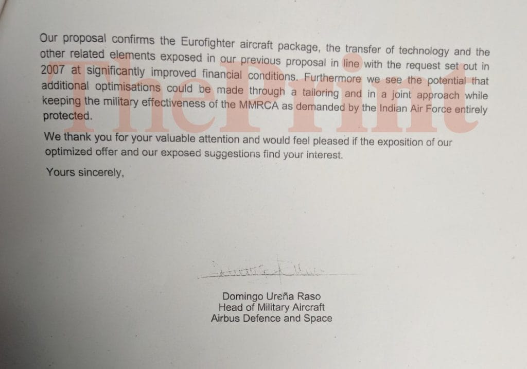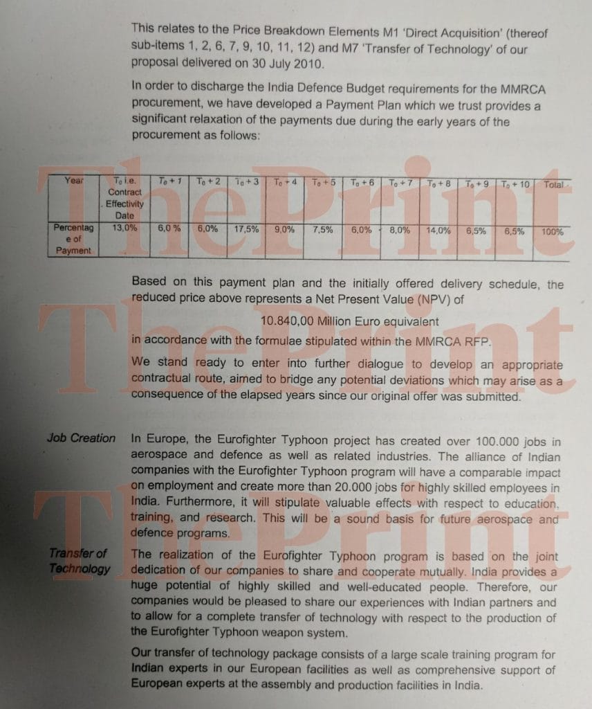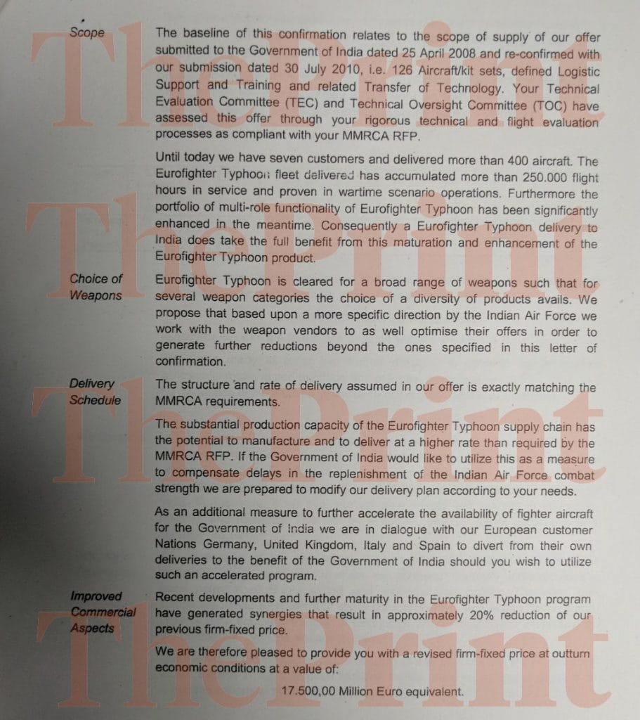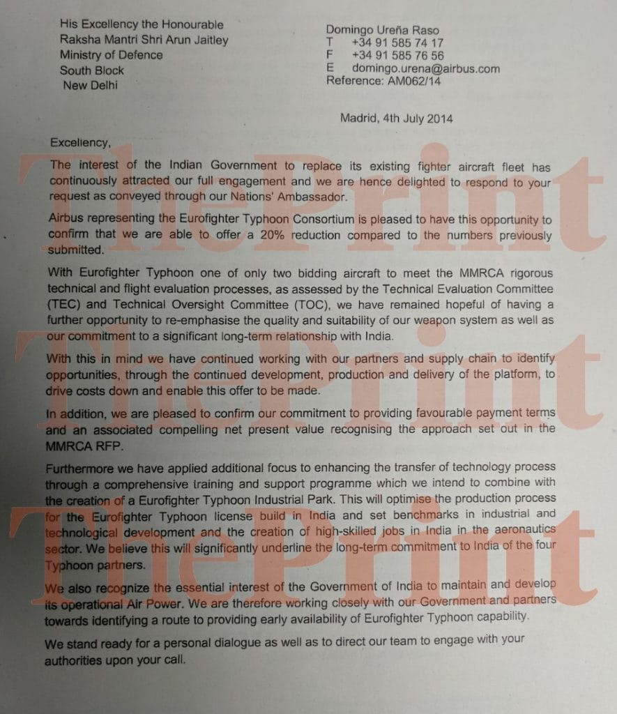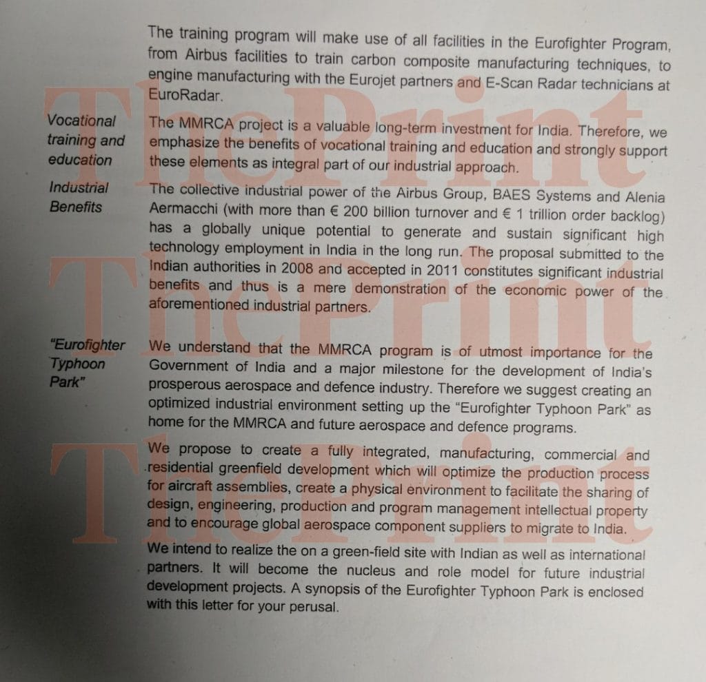 The offer – made at the top level of the Indian government – involved diverting deliveries of Eurofighter Typhoon jets from Britain, Italy and Germany to meet urgent Indian requirements. The offer also pledged to set up a full production line for transfer of technology of the combat jets. (Read full letter)