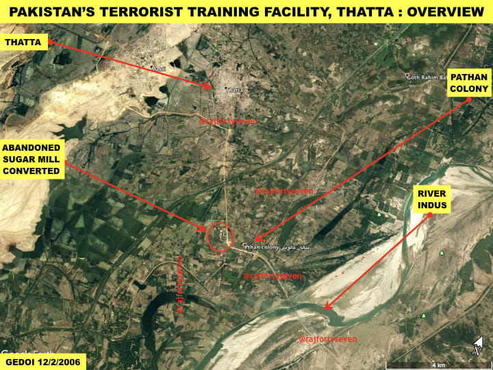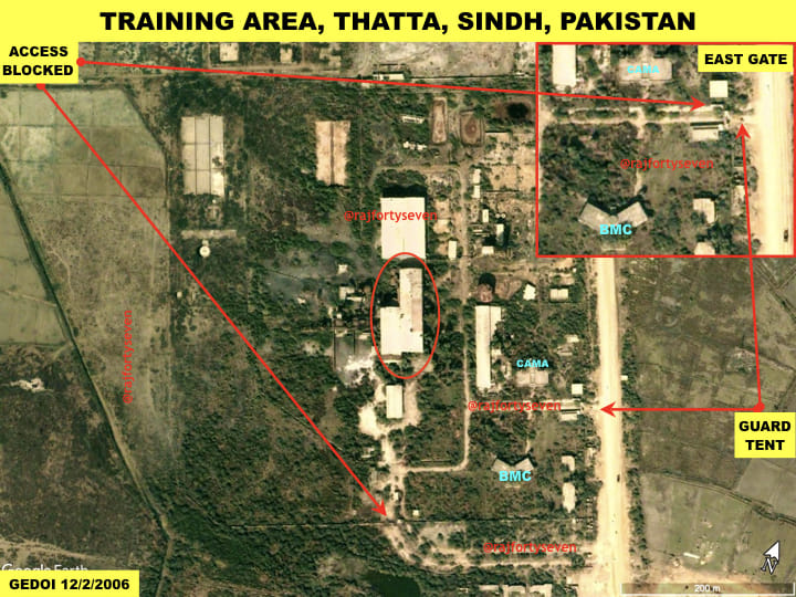 According to satellite images from around 2008, the safe-house where the terrorists were trained is located in ‘Pathan Colony’, around 6 km south-east of Thatta town.