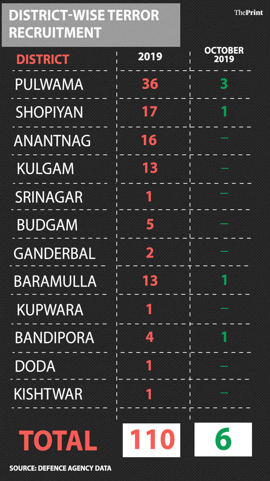Figures tabulated by defence agencies show that 110 youths, mostly from south Kashmir, have joined the terror ranks in 2019, including 36 from just one district — Pulwama.