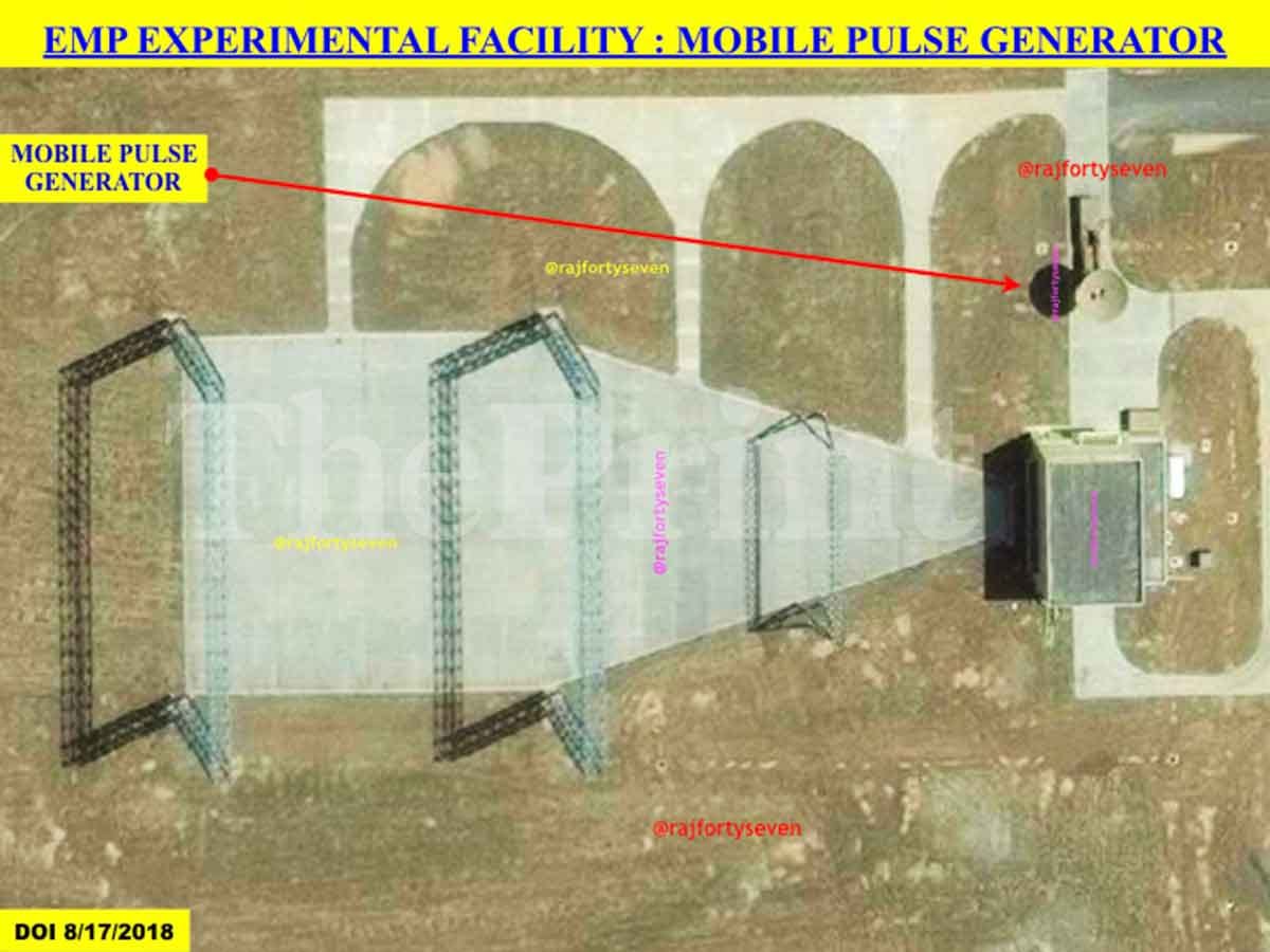 The test location shows an EMP generator hanging on multiple bar poles — similar to structures observed at Naval Air Station Pax River in Maryland, USA.