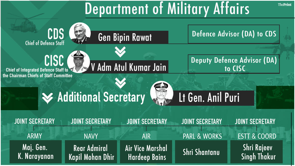 As reported by ThePrint in 2019, the DMA will be in charge of the affairs of the Army, the Navy and the Air Force. At the moment, the CDS will have no operational control over individual organisations, which will remain with the respective service chiefs.