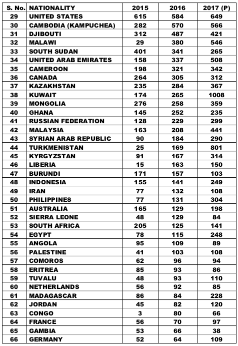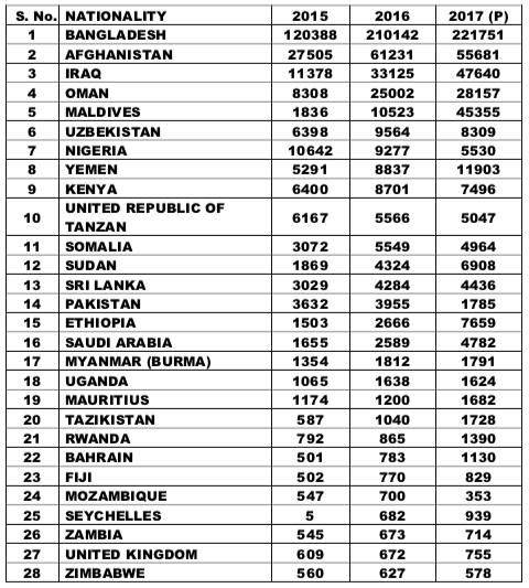 The minister also provided a list of tourists coming from different countries. While Bangladesh topped the list with 2,21,751 tourists, Afghanistan came second with 55,681 in 2017 and 61,231 in 2016. With 47,640 people, Iraq stood third.