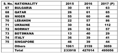 More than 2 lakh Bangladeshi tourists came to India in 2017 followed by 55,681 from Afghanistan and 47,640 from Iraq, says tourism minister.