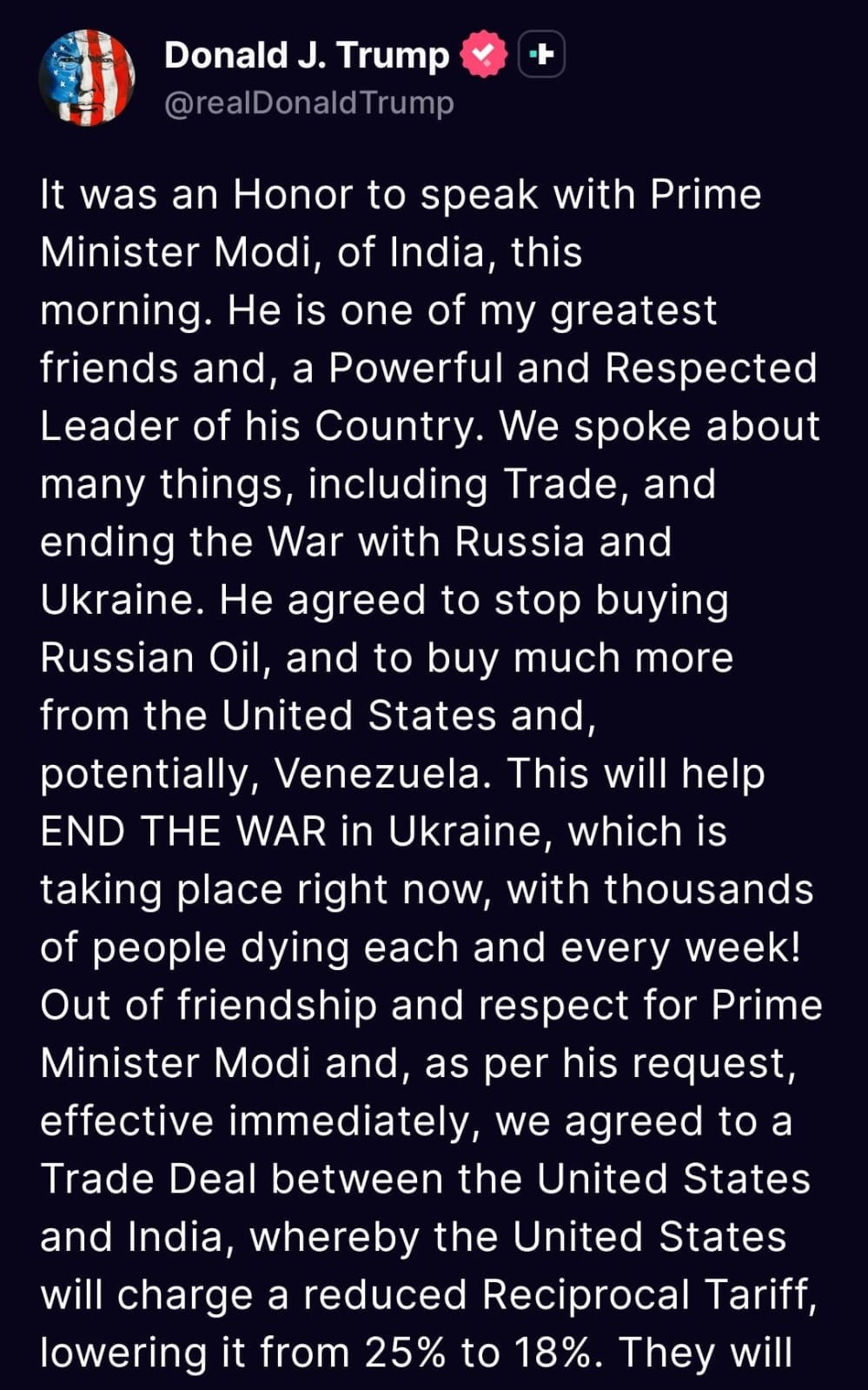 The post further said: “Out of friendship and respect for Prime Minister Modi and, as per his request, effective immediately, we agreed to a Trade Deal between the United States and India, whereby the United States will charge a reduced Reciprocal Tariff, lowering it from 25% to 18%. They will likewise move forward to reduce their Tariffs and Non Tariff Barriers against the United States, to ZERO.