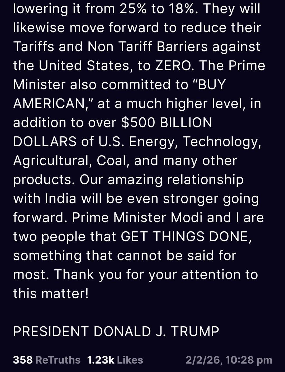 Trump wrote that Modi had also “committed to ‘BUY AMERICAN’”, at a much higher level, in addition to over $500 BILLION DOLLARS of US energy, technology, agricultural, coal, and many other products”.