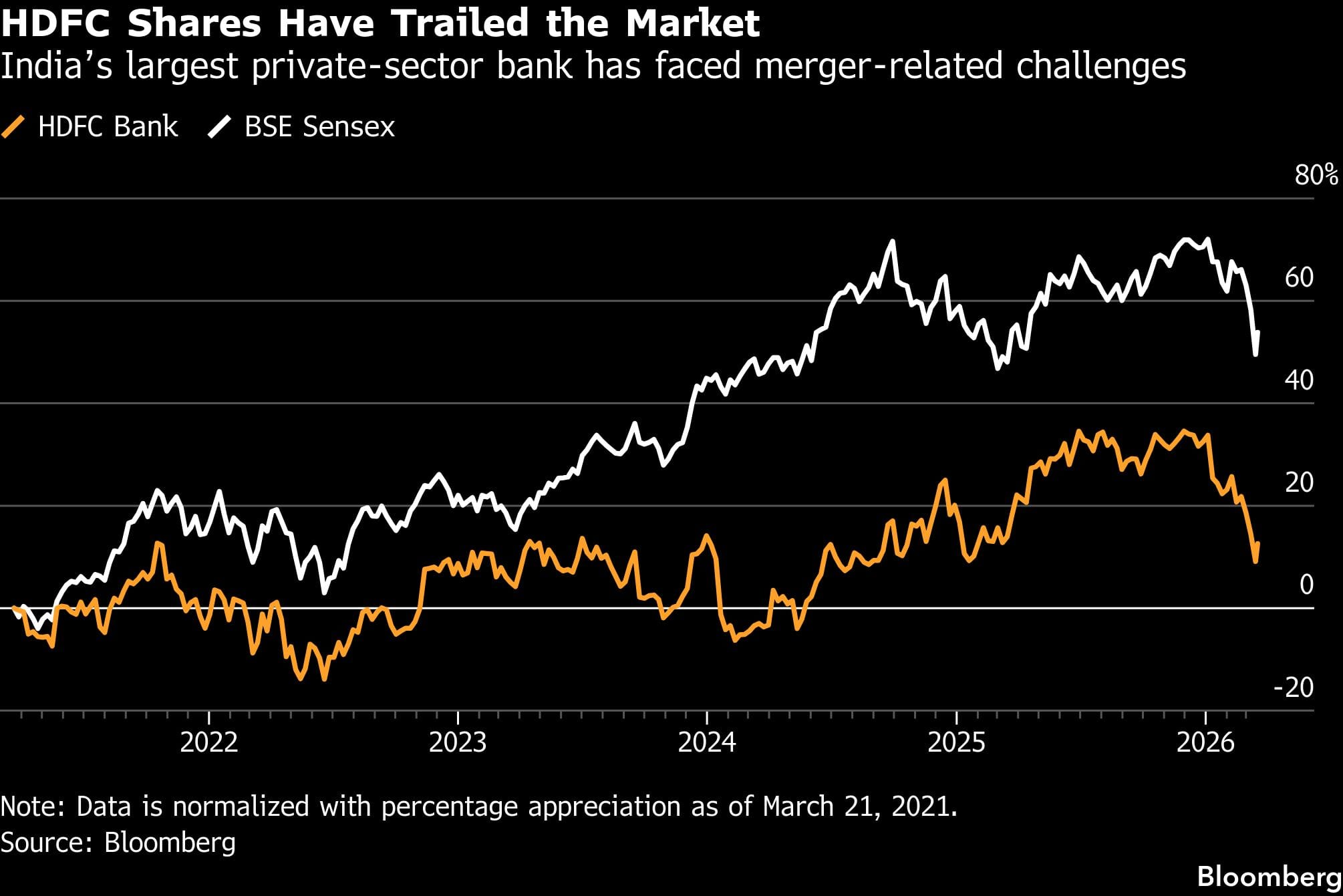 HDFC Bank has struggled since it merged with Housing Development Finance Corp. in 2023. The deal saddled the combined entity with a large pool of long-tenor home loans, which has weighed on its liquidity and margins. The lender’s shares have underperformed the broader market and large private-sector rivals since the merger.