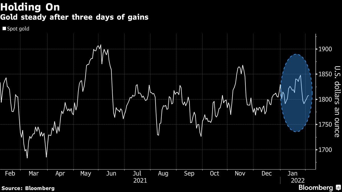 Spot gold was little changed at $1,806.64 an ounce as of 1:07 p.m. in Singapore, after climbing 0.9% in the last three days. The Bloomberg Dollar Spot Index rose 0.1% after dropping 0.2% in the previous session. Silver declined, while platinum and palladium advanced. Markets in China remain closed for the Lunar New Year holidays.-Bloomberg