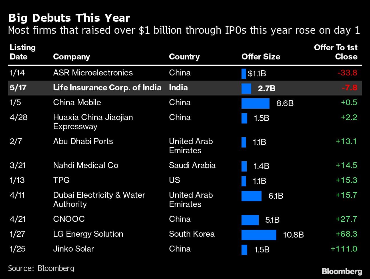 LIC’s is the fourth-largest deal among global IPOs priced this year, coming when there’s a dearth of large-size offerings in financial hubs from New York to London and Hong Kong. There hasn’t been any listing exceeding $1 billion in Hong Kong or Europe so far this year.
