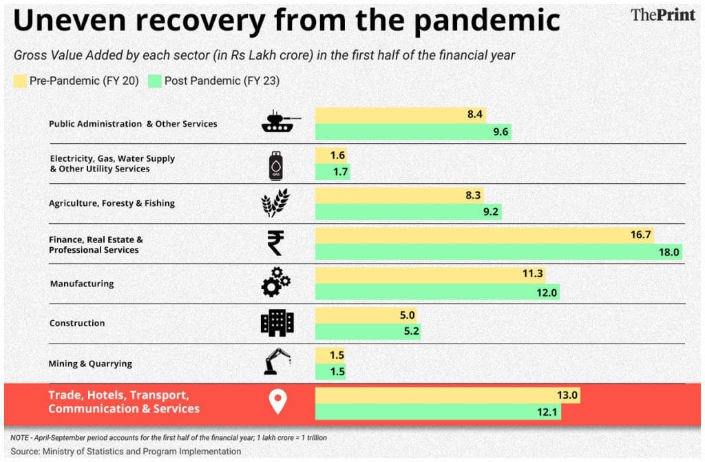 At Rs 12.1 lakh crore, the gross value addition, or GVA, in this sector for the first half of 2022-23 was about 7.2 per cent lower than Rs 13 lakh crore in the first half of FY 2019-20.