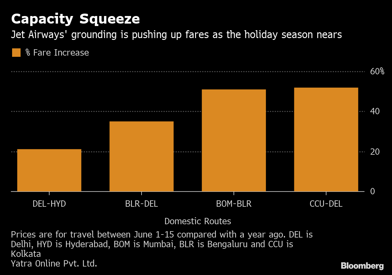 About a hundred people, including uniformed Jet Airways pilots, took to the streets on Thursday in New Delhi to ask Prime Minister Narendra Modi to intervene. As they pressed for a rescue, airfares for domestic travelers are expected to climb 30 percent on average as capacity is squeezed heading into a peak travel period, according to flight-booking website Yatra Online Pvt Ltd. Fares of some international routes have also spiked.