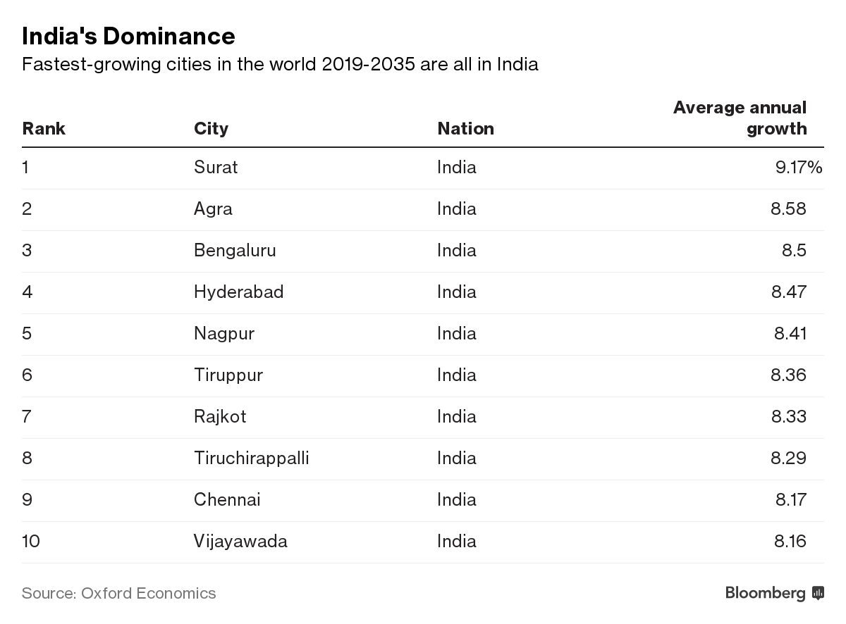 Surat, a diamond processing and trading center in the western state of Gujarat, will see the fastest expansion through 2035, averaging more than 9 percent, Richard Holt, Oxford’s head of global cities research, wrote in a report. All of the 10 fastest over that period will be in India.