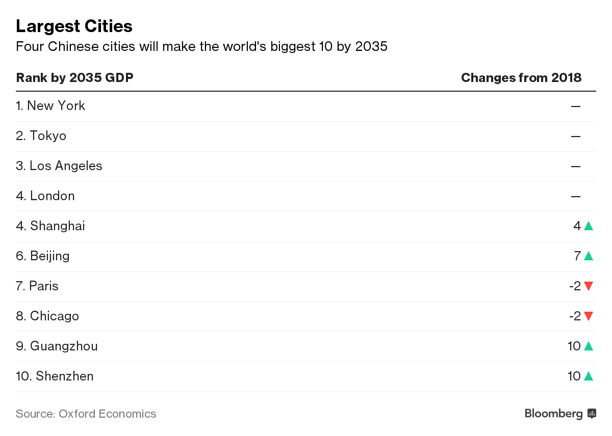 New York, Tokyo, Los Angeles and London will defend their spots as Shanghai and Beijing — each boasting more than 20 million people — surpass Paris and Chicago. Guangzhou and Shenzhen in Southern China will also make the top 10, crowding out Hong Kong.