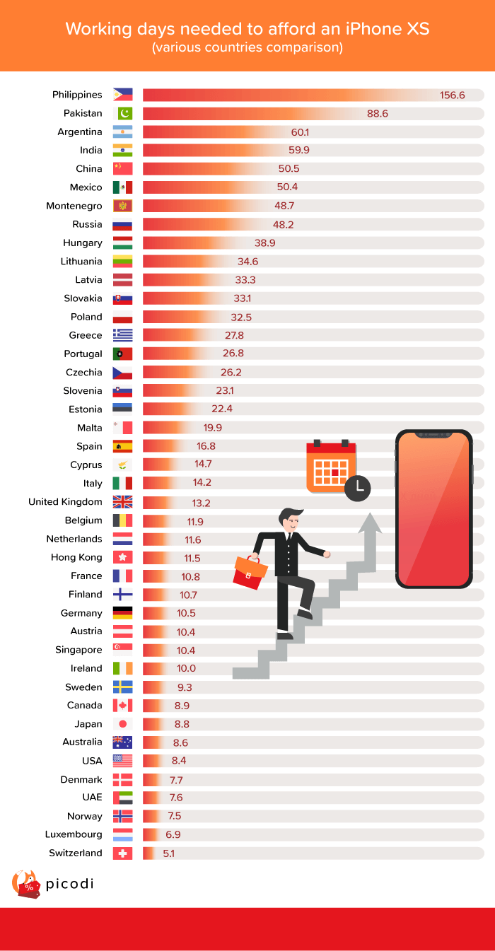 The results are based on how many days a person would need to work to afford the iPhone XS 64GB variant. The research also takes into account price for this particular iPhone model and official data about average wages.