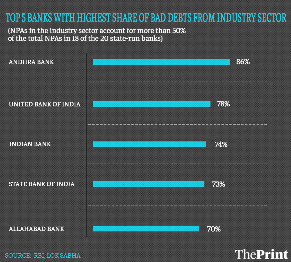The country’s largest bank, State Bank of India (SBI) had 73 per cent of its bad debts from the industry sector, followed by Allahabad Bank at 70 per cent.