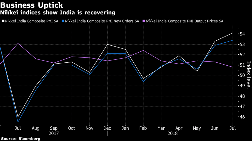 India’s main services index rose at the fastest pace in 21 months in July, the latest purchasing managers survey showed, while manufacturing continued to expand, but at a slower pace. These together pushed the composite index to its highest level since October 2016. The optimism stems from a rise in new orders, giving confidence to businesses to produce more.