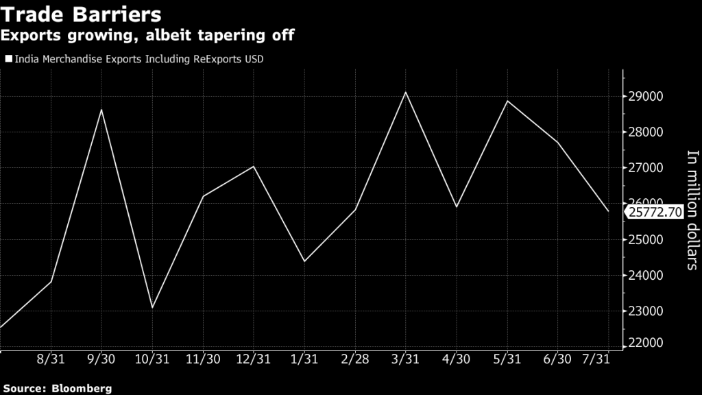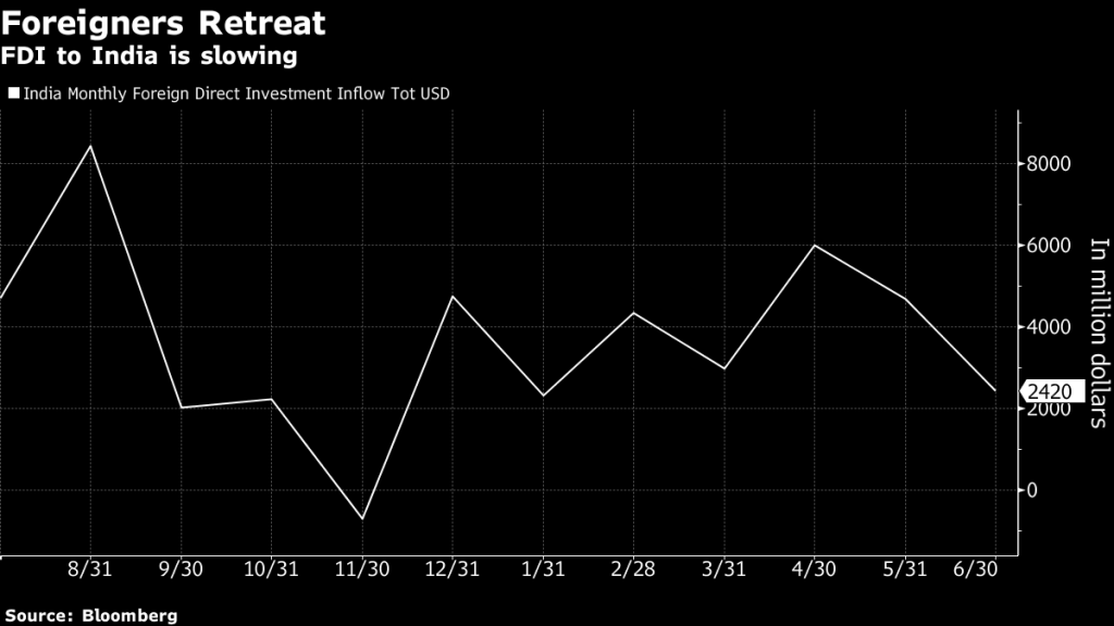Demand for bank loans remained solid going into the July quarter despite rising interest rates, and so was the case with services and manufactured goods, a cross-section of forward-looking indicators compiled by Bloomberg News show ahead of government data on economic growth due 31 August. Foreign investments slowed, highlighting risks to India’s balance of payments position.