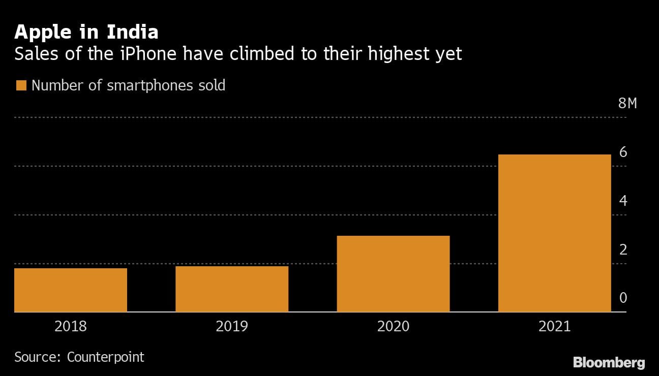 “It’s a turning point for Apple in India,” said Neil Shah, the Mumbai-based partner and research head at Counterpoint Technology Market Research. “Indians were willing to lavish money on premium phones during the pandemic because everyone’s lives revolved around their devices and there was nothing else to spend on.”