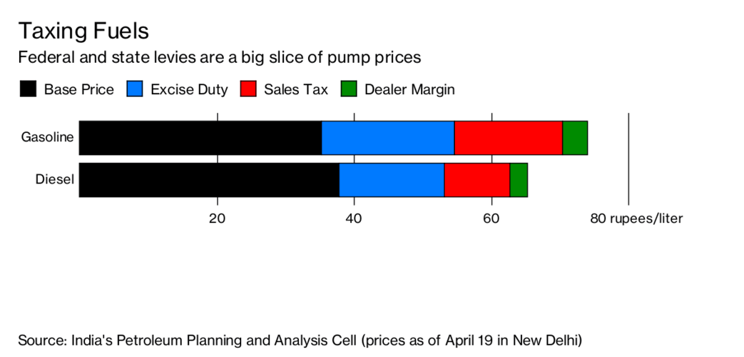 Federal taxes on diesel were increased five times since September 2014, to 17.33 rupees a liter, before a 2 rupees-a-liter reduction last October. That cut, along with a reduction in petrol taxes, were estimated to have reduced the government’s revenue by 260 billion rupees during the year ended March. Still, taxes account for more than half of the retail price of petrol. On April 19, the pre-tax petrol price in New Delhi was 35.20 rupees a liter. It finally sold for 74.10 rupees a liter after adding taxes and dealer margins.