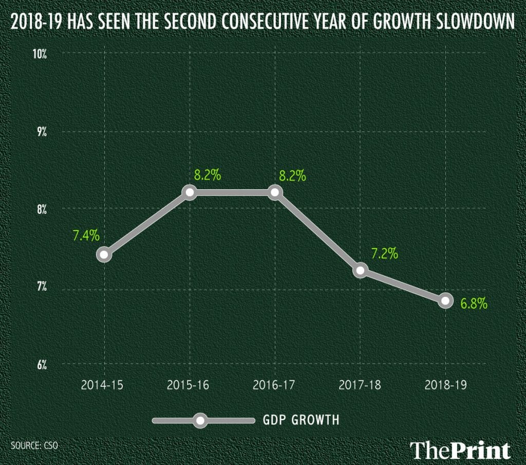 The full year GDP growth for 2018-19 came in at 6.8 per cent as against 7.2 per cent in 2017-18 and 8.2 per cent in 2016-17, marking the second consecutive year of growth slowdown seen by the Indian economy under the Modi government.