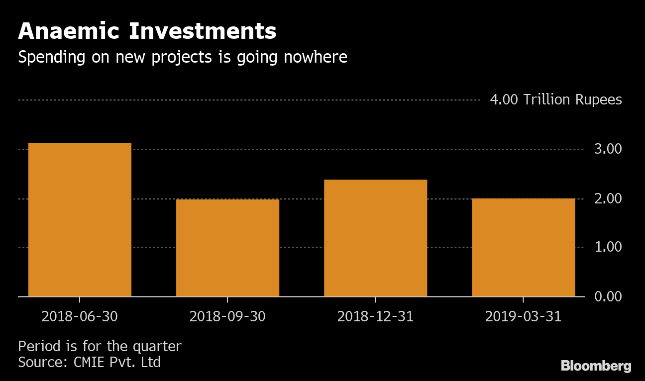 Businesses are curbing investments in an environment of mounting global risks and sluggish domestic demand. The total value of new projects in the quarter that ended in March fell to 1.99 trillion rupees ($29 billion) from 3.12 trillion rupees in the three months through June, according to data from the Center for Monitoring Indian Economy.