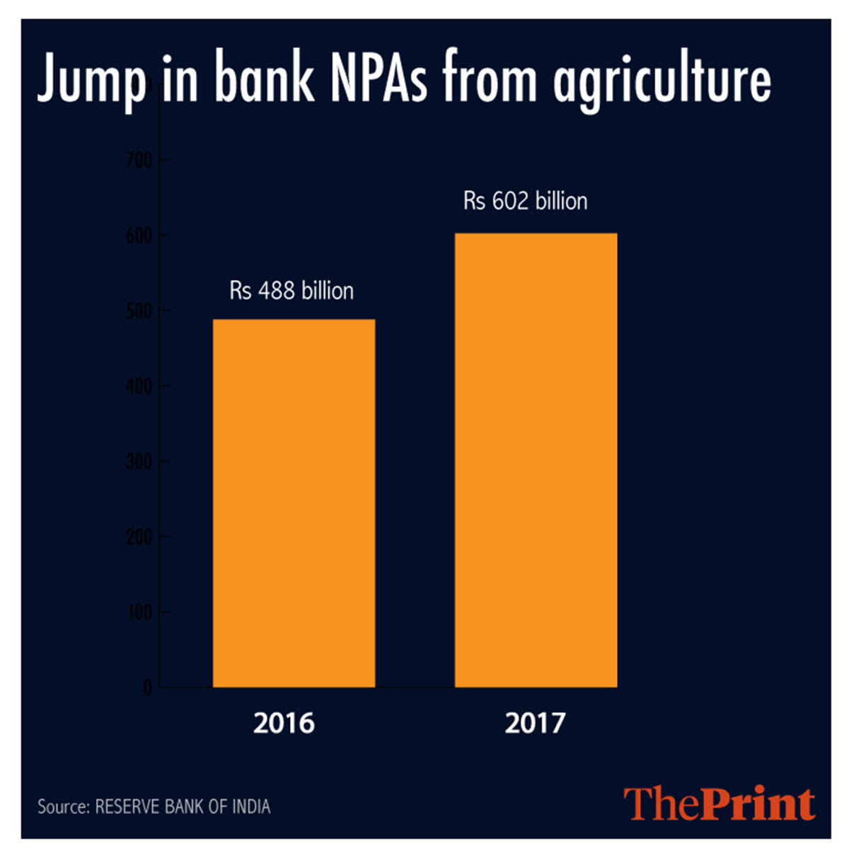 Data with the Reserve Bank of India (RBI) reveals that bank NPAs from agriculture shot up to Rs 602 billion as of March 2017, as against Rs 488 billion in the same month in 2016.
