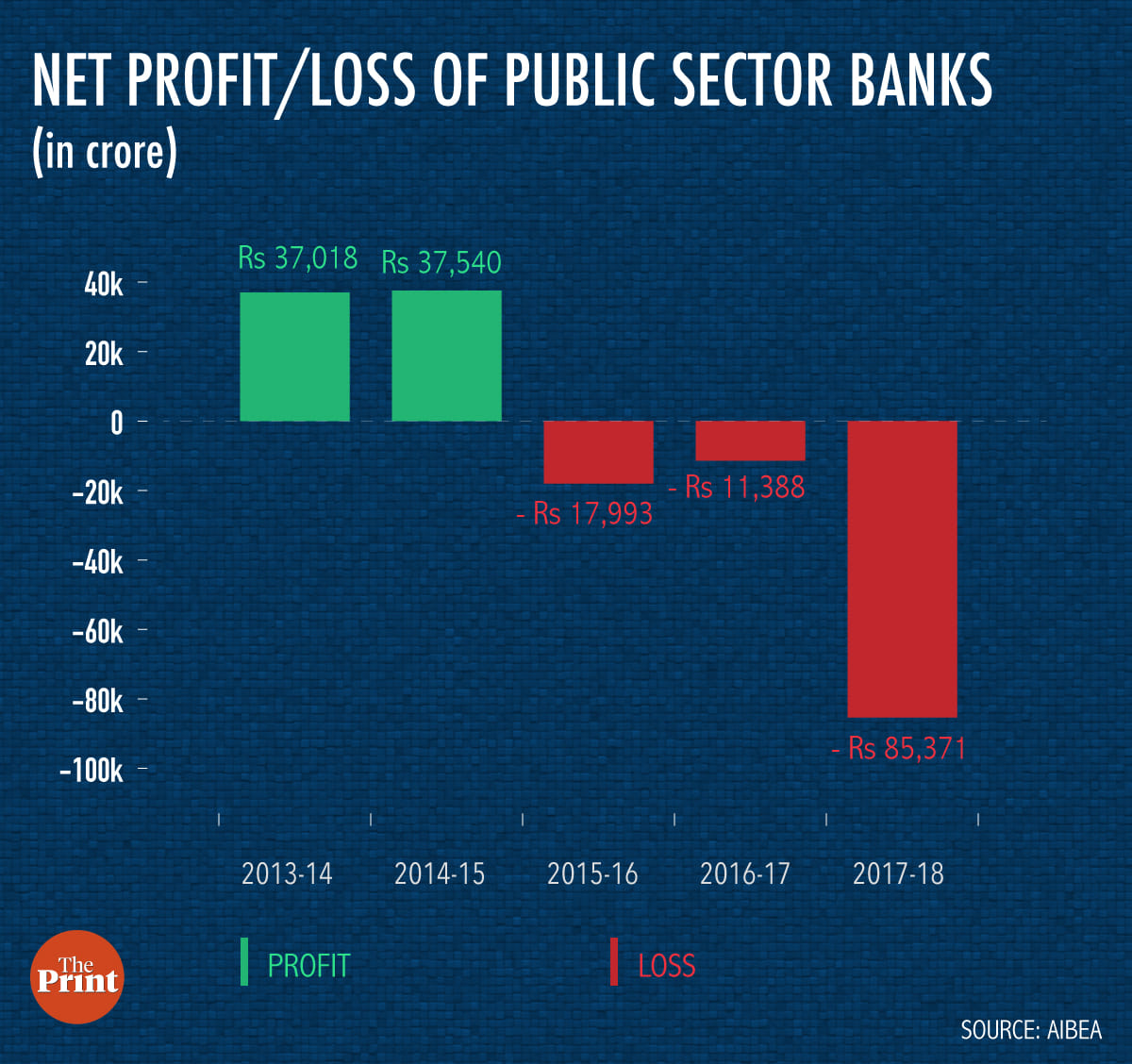 In fiscal 2015-16, before the BBB started operations, PSBs reported a net loss of Rs 17,993 crore. The next year, the losses narrowed a bit to Rs 11,388 crore before rising to a staggering Rs 85,371 crore in 2017-18, data from the All India Bank Employees Association shows.