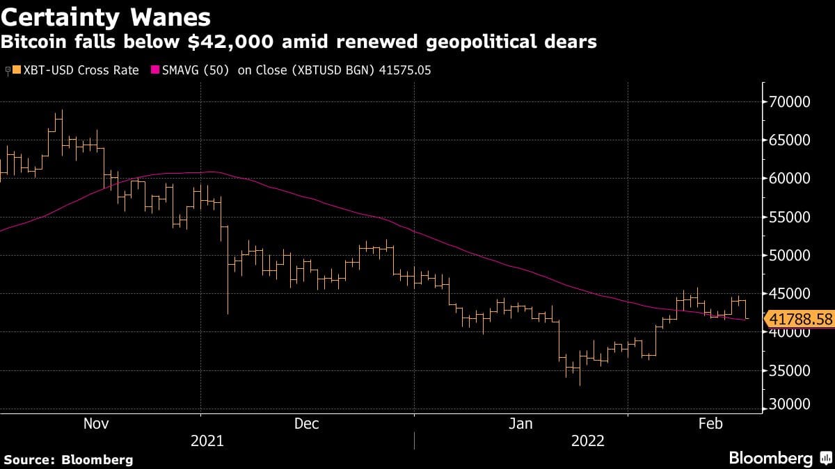 New York: Bitcoin fell below $41,000, testing its 50-day moving average, as renewed fears of a possible Ukraine invasion by Russia weighed on global markets including risk assets.