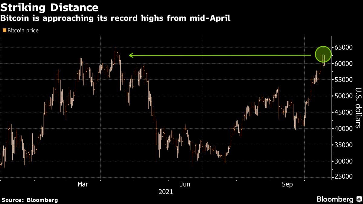 The largest cryptocurrency rose as much as 2.6% in Asian trading Tuesday and was hovering near $62,600 as of 12:03 p.m. in Hong Kong. It’s more than doubled this year in volatile trading. The April record is just under $64,870.